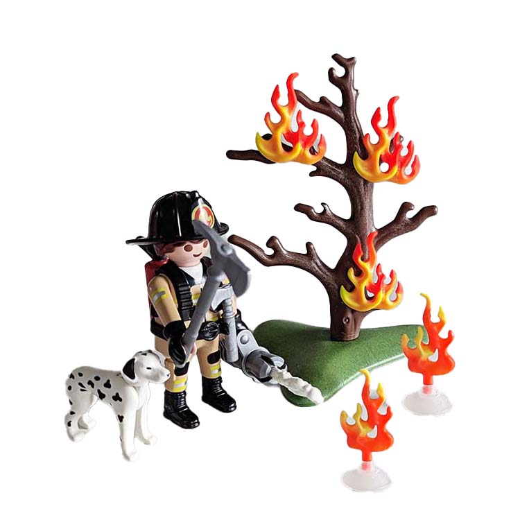 Deze set bevat 1 Playmobil brandweerman en een dalmatier hond. Verder zitten er in dit koffertje leuke brandweer accessoires zoals een bijl, bluskanon dat echt kan schieten en een boom met vlammen.