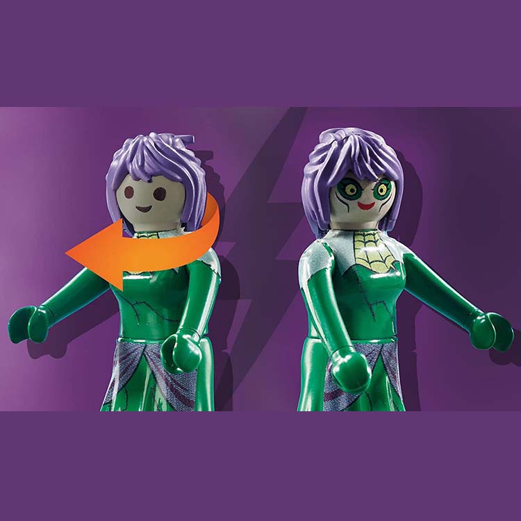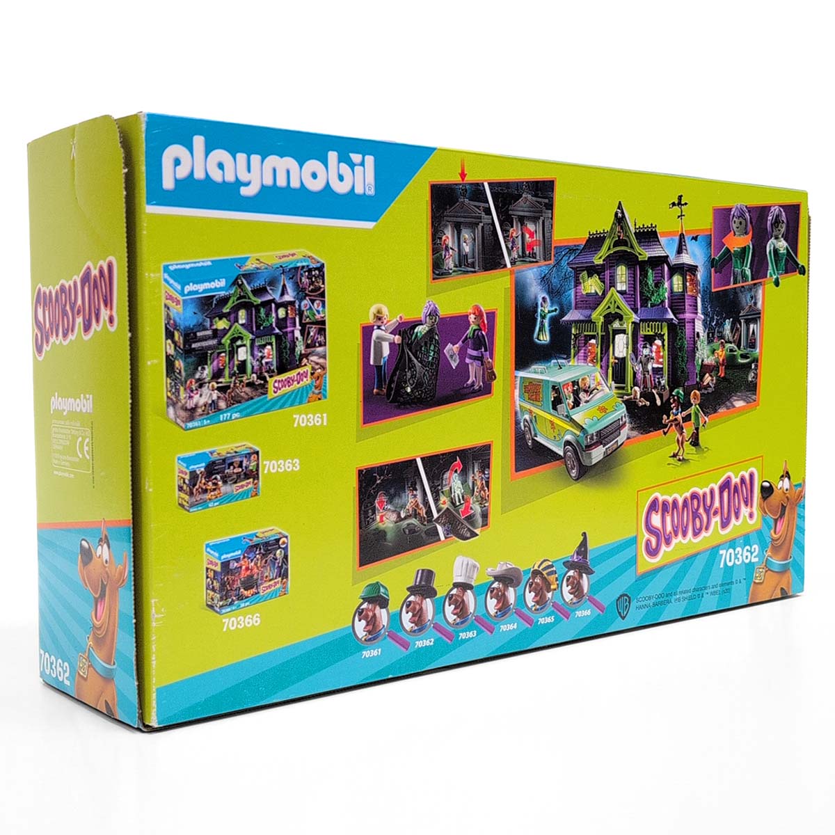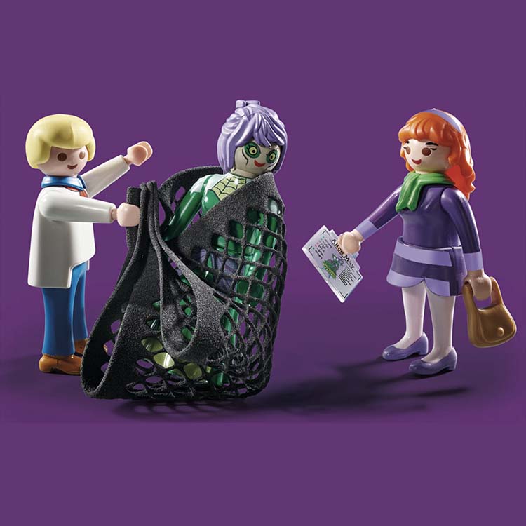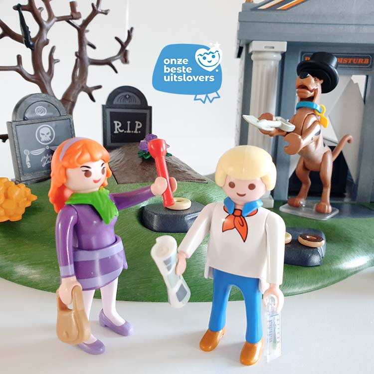 Scooby-Doo, Fred en Daphne hebben een griezelige puzzel op te lossen op het kerkhof. Er liggen wat spookachtige verrassingen op de loer op dit kerkhof. Terwijl de vrienden een graf onderzoeken, springt er plotseling een griezelig skelet uit de grond (druk maar op de kaars naast het graf). Het skelet geeft licht in het donker, voor nog meer griezelplezier! Bovendien geeft de mysterieuze kist met verdwijnende figuren nog wat meer puzzels. De waterspuwer boven de ingang van de crypte is eigenlijk een geheime hendel om de stenen platen boven de toegangsdeur te openen, waardoor ongenode gasten niet binnen kunnen komen of niet kunnen vluchten. De meegeleverde spookkaart geeft handige tips om het spook te vinden en vervolgens te vangen met het net. Maar laat je niet misleiden door het vriendelijke gezicht van de geest! Snel wordt de geest ontmaskerd en de ware schurk toont zijn gezicht – Alice May! Scooby-Doo! schrikt ervan 🙂 Meesterlijk mooie set, 100% compleet verkeerdend in nieuwstaat.