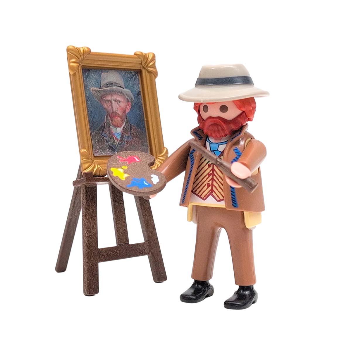 Vincent van Gogh. Vincent Willem van Gogh (1853 – 1890) was een Nederlands kunstschilder. Zijn werk valt onder het postimpressionisme, een kunststroming die het negentiende-eeuwse impressionisme opvolgde. Van Goghs invloed op het expressionisme, het fauvisme en de vroege abstractie was enorm en kan worden gezien in vele andere aspecten van de twintigste-eeuwse kunst. Het Van Gogh Museum in Amsterdam is gewijd aan het werk van Van Gogh en zijn tijdgenoten. In het Kröller-Müller Museum bevindt zich de op één na grootste Van Goghverzameling ter wereld. Van Gogh wordt gezien als een van de grootste schilders van de 19e eeuw. Deze erkenning kwam echter pas laat. Deze speciale Playmobil uitvoering van Vincent van Gogh bevat onder andere een schildersezel met zelfportret, verfpalet en penseel.
