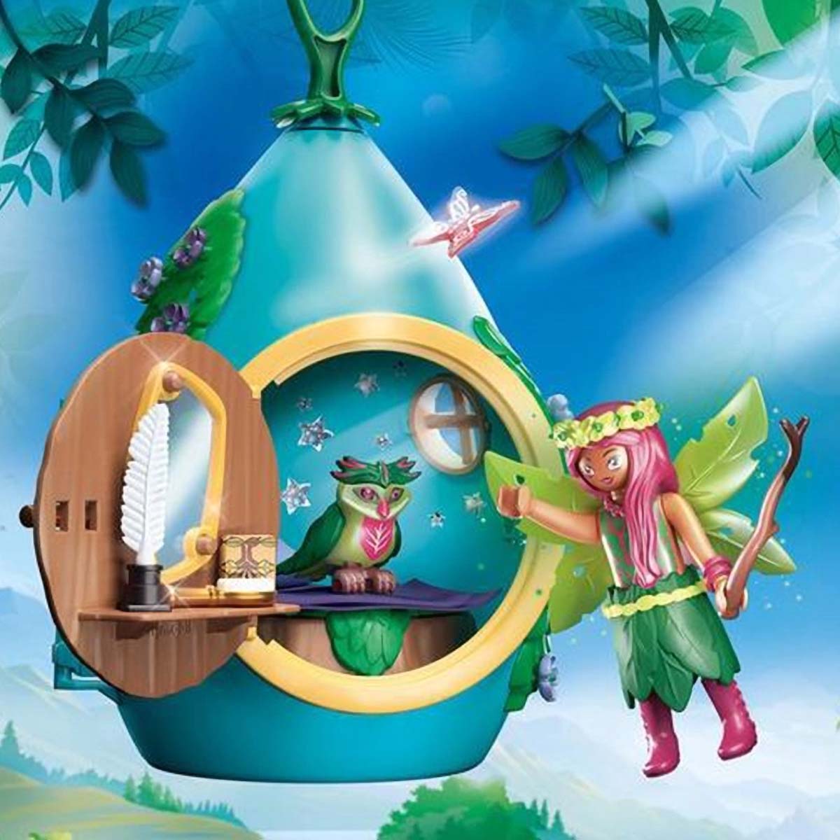 Adventures of Ayuma Druppelvormig huis. In het mystieke bos voelen de Forest Fairies en hun totemdieren zich vooral thuis. Deze betoverende Forest Fairy en haar geliefde metgezel, de uil, noemen een gezellige fee?nhut hun thuis. Als het tijd is om te gaan slapen, kamt de fee haar haar voor de spiegel, trekt haar bladerrijke rok uit en stapt in haar warme bed van bladeren. Het kleine bloemenlampje boven het bed geeft licht. Nu is het tijd om de deur dicht te doen en naar dromenland te gaan.