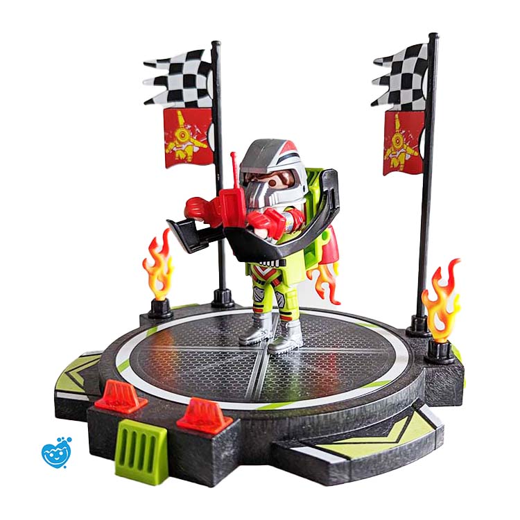 Alleen een echte stuntman durft met een jetpack het luchtruim in. De showman staat nog steeds op het podium en zwaait naar de toeschouwers. Dan start hij de jetpack en komen de vlammen uit de sproeiers. De stuntman gaat eerst langzaam de lucht in, maar gaat steeds sneller en sneller. Deze Playmobil speelset bevat een jetpackvliegtuig, voetstuk met vlaggenmasten, radio, handschoenen, helm en vele andere extra’s. Helm en vlieguitrusting zijn afneembaar. Inclusief 1 Playmobil speelfiguur.