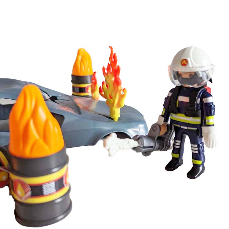 De brandweerman nadert de brandhaard met de draagbare blusschuimspuit en probeert met gerichte schuimstralen de vlammen onder controle te krijgen. Zijn collega ondersteunt hem met praktische tips. PLAYMOBIL Starter Packs zijn ideaal als start of aanvulling op de vele kleurrijke PLAYMOBIL speelwerelden. De set bevat twee PLAYMOBIL-brandweerlieden, een autowrak, drie vaten met aankoppelbare vlammen, een blusschuimwerper, handschoenen, helmen en andere brandbestrijdingsmiddelen.