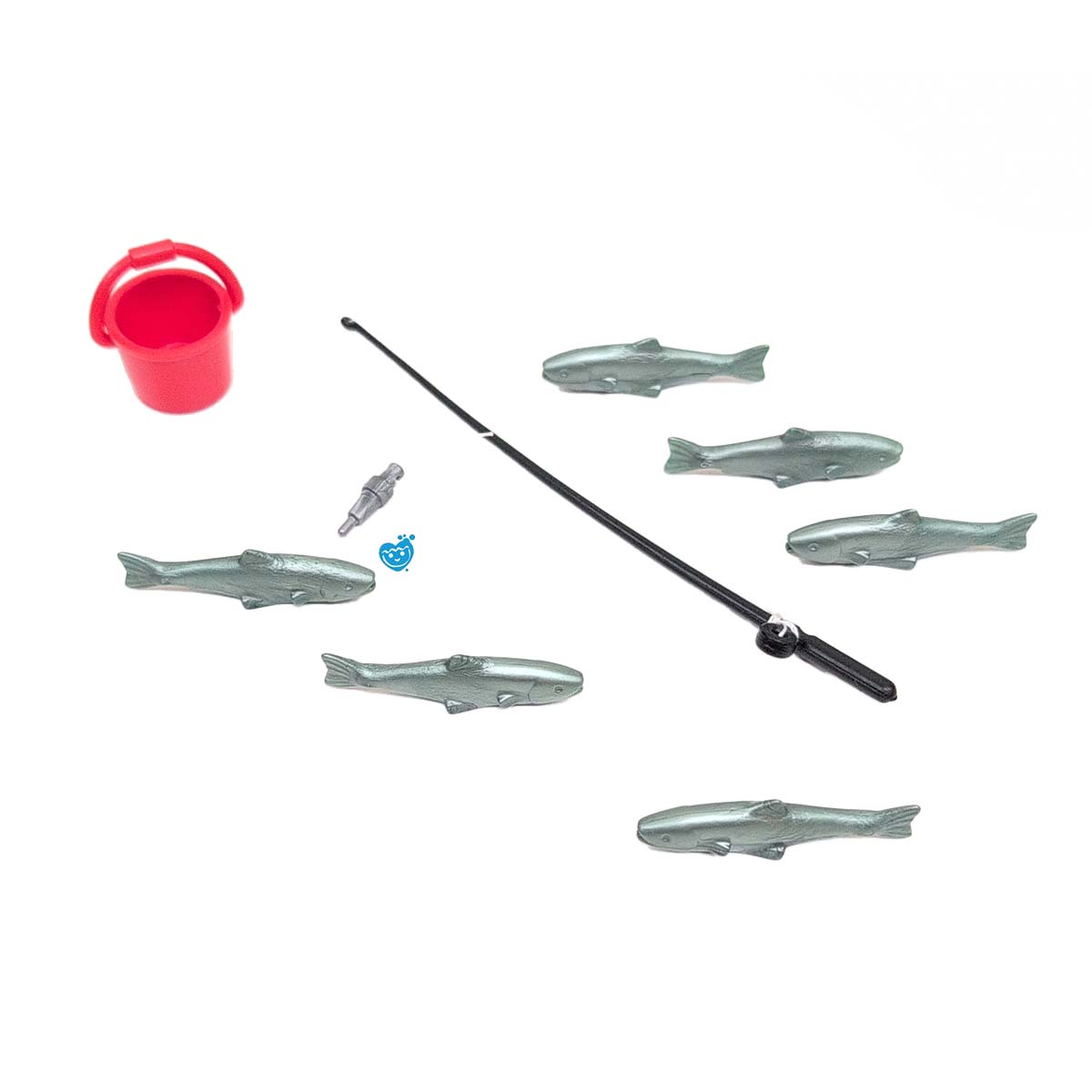 Setje Playmobil vis-accessoires: 6 visjes, 1 hengel met draad, 1 rood emmertje en 1 klein koppeling-/accessoirestukje. Perfect als aanvulling voor vissers, camping, boot, markt of dierentuin/zeewereld-scenes.