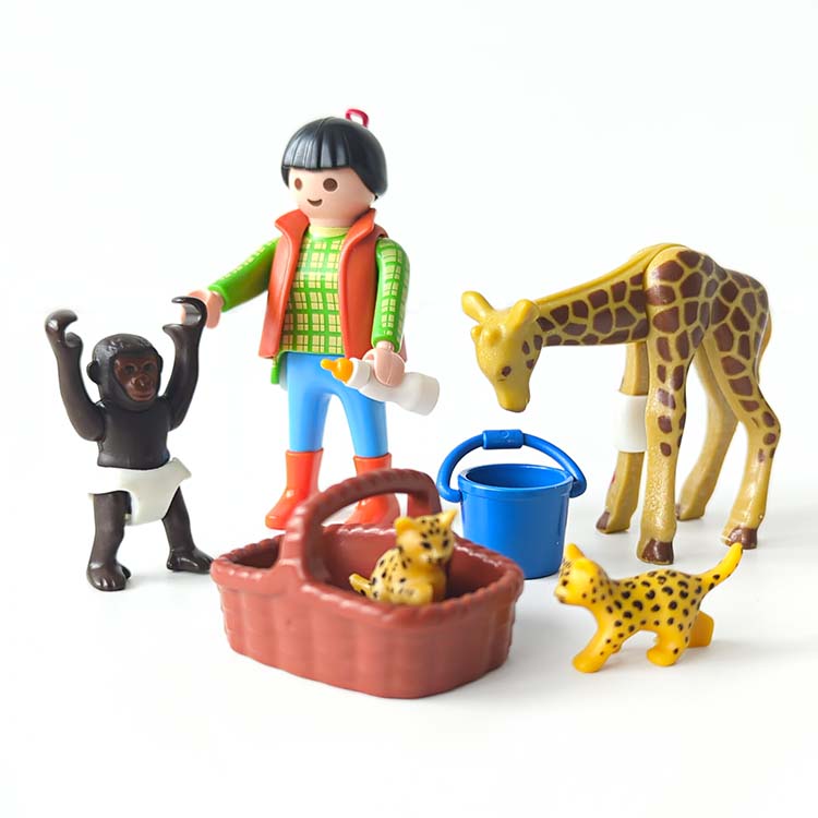 Voedertijd! Het is de hoogste tijd om het hongerige Playmobil girafje, jachtluipaardjes en aapje te voederen. De verzorgster van de dierentuin maakt hiervoor gebruik van een fles met speen. Inclusief, verband, mand, emmer en luier. Deze set is gelijkwaardig met Playmobil set 7970, het poppetje is anders.