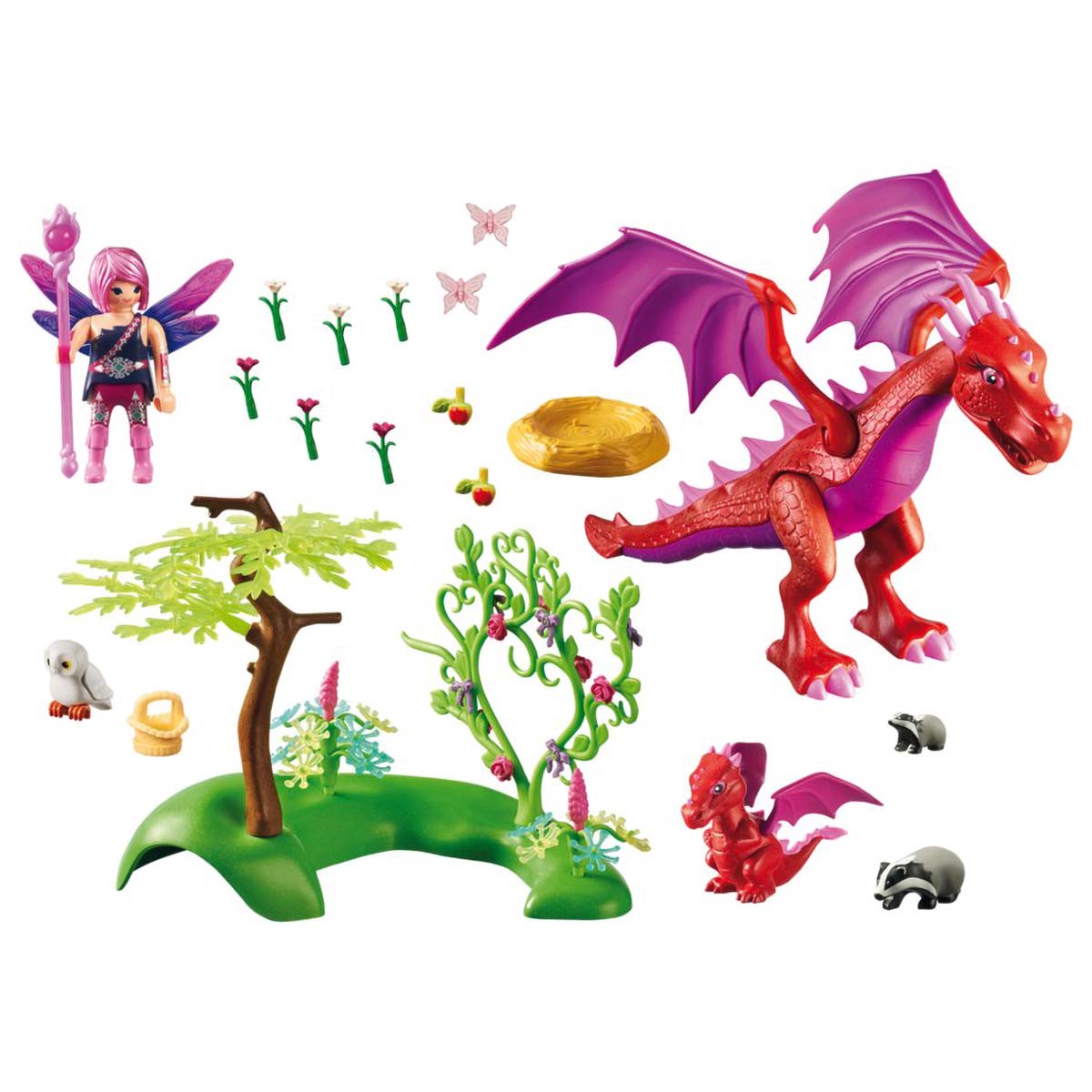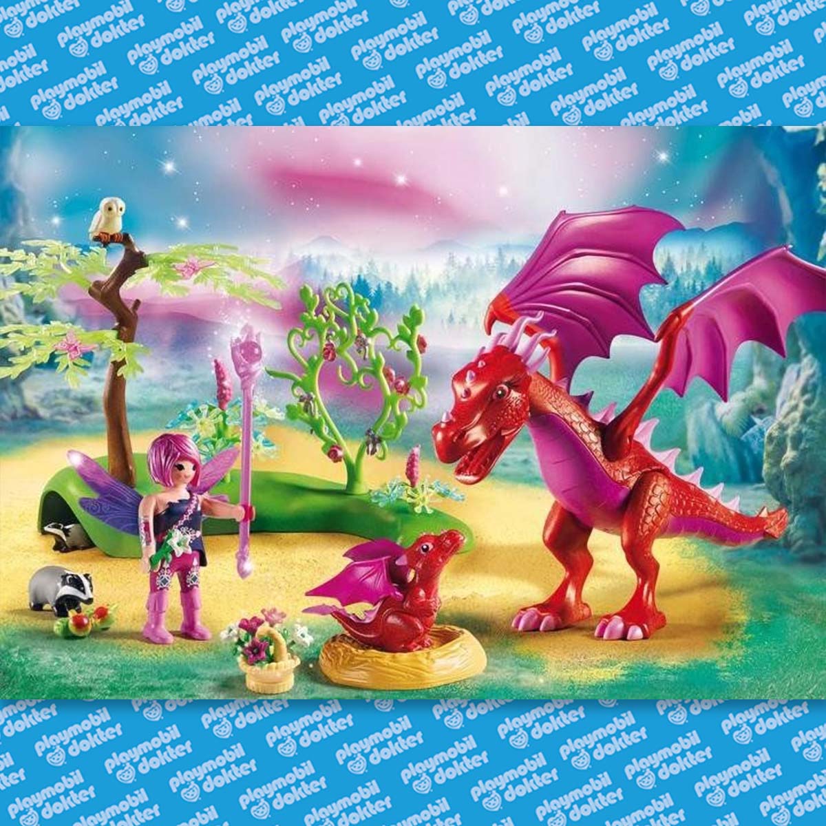 Let op deze set heeft geen kleine rode draak! Playmobil 9134 Drakenhoeder met rode draken. De fee kan op de grote Playmobil draak rijden. In de kleine grot vinden de dassen een schuilplaats. De drakenmoeder kan haar benen individueel bewegen en de nieuwe kop evenals de onderkaak naar boven en beneden klappen. De vleugels zijn dankzij de scharnieren in alle richtingen beweegbaar. Op de rugkam bevindt zich een voetklem, zodat een figuur op de draak kan rijden. Onder de boom bevindt zich een kleine grot voor de dassen. Inclusief 1 Playmobil speelfiguur.