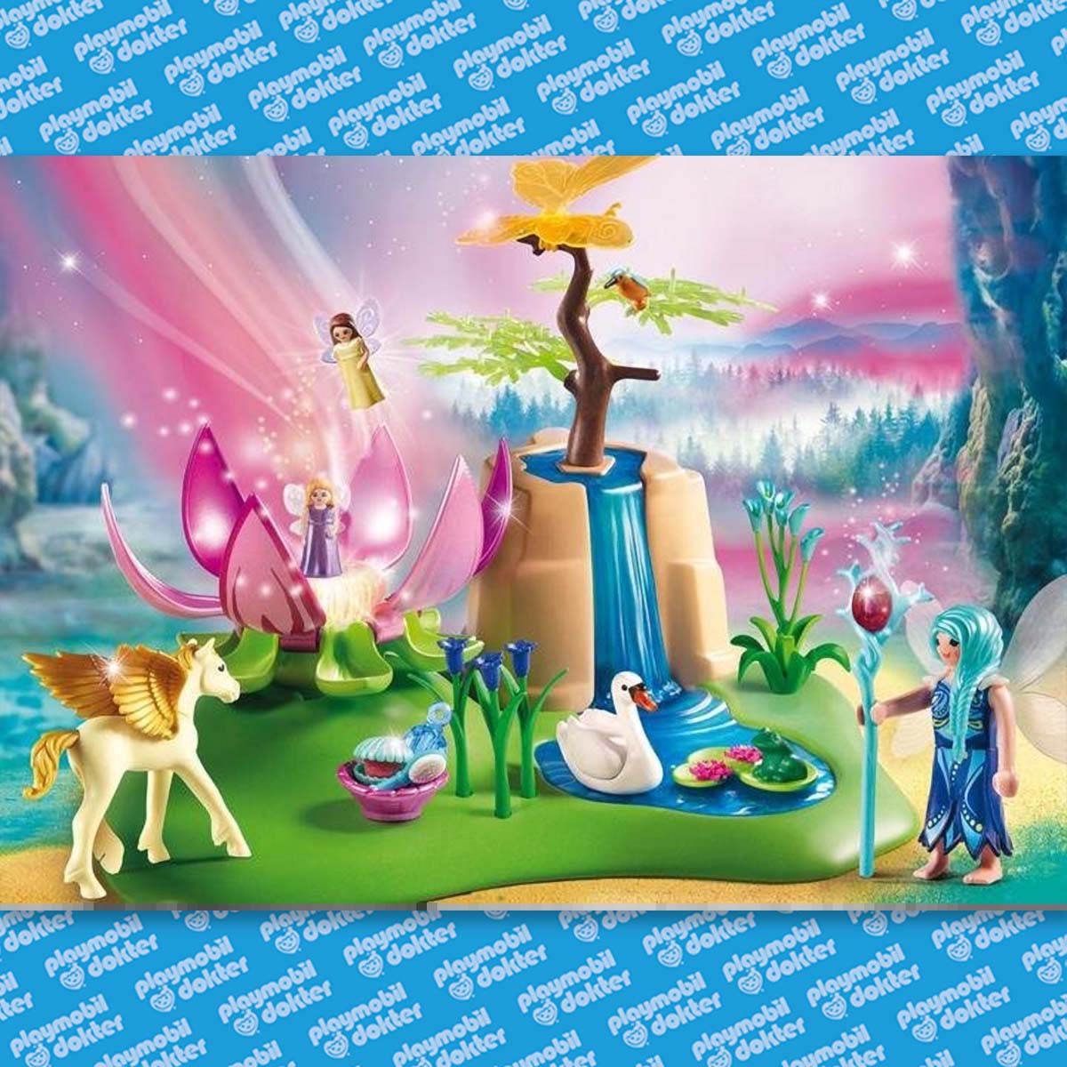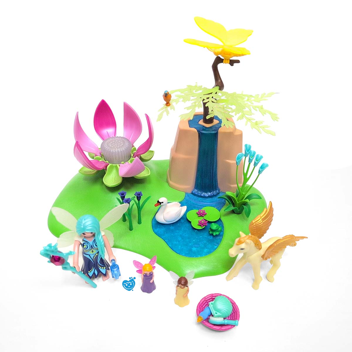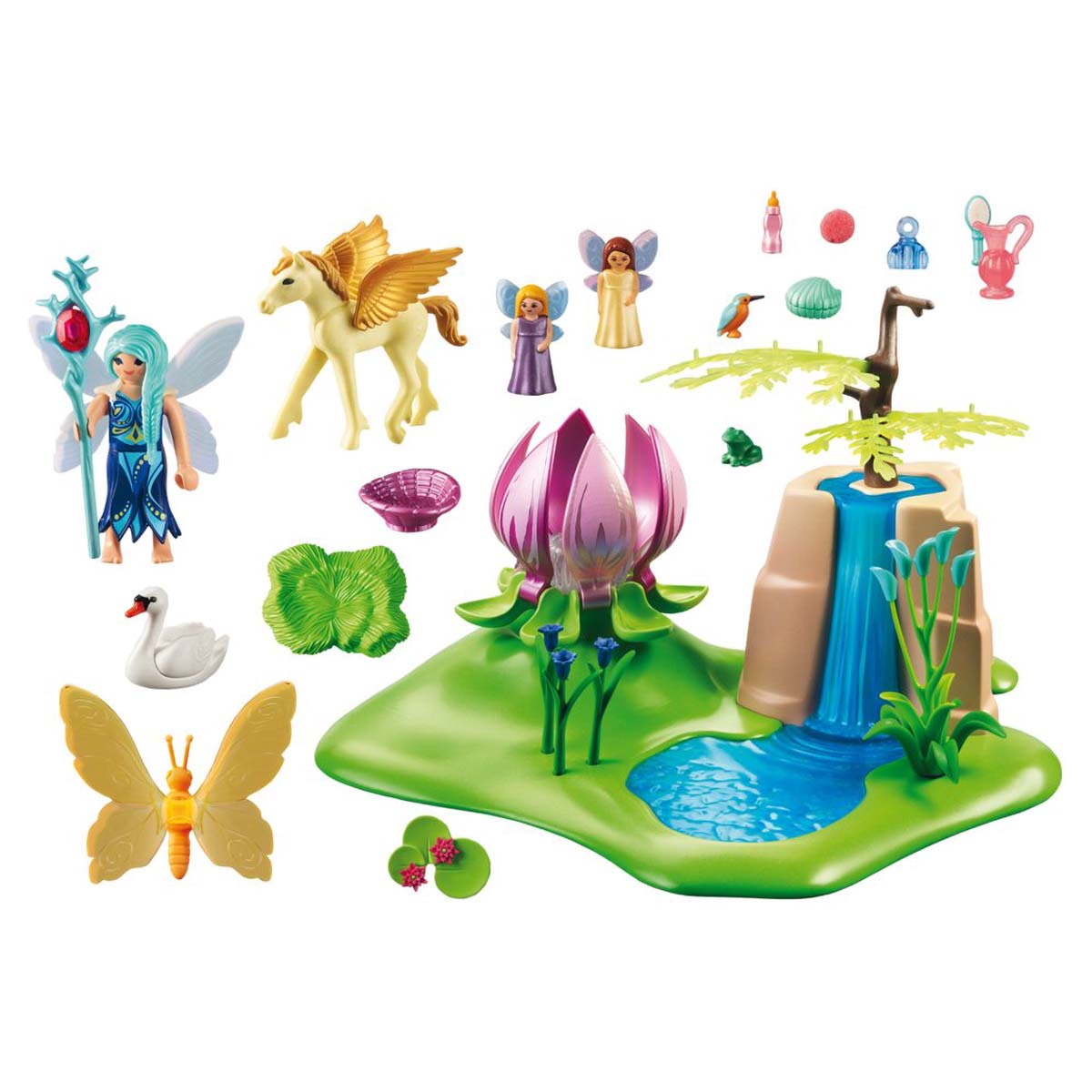 Automatische uitschakeling: na ca. 4 minuten. Aan de zijkant achter de waterval bevindt zich een grot. De feeënbaby kan niet bewegen, het vleugelelement is afneembaar. Incl. 1 Pegasus veulen, zwaan, kolibrie, reuze vlinder en 2 kleine elfjes en 1 Playmobil speelfiguur.