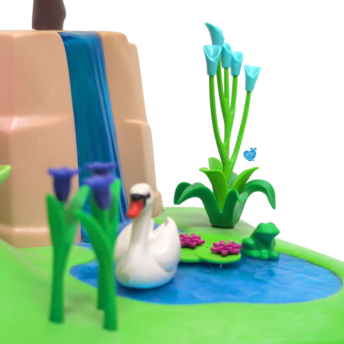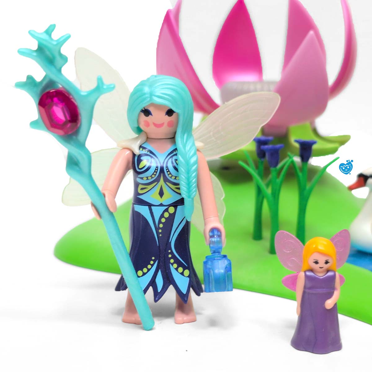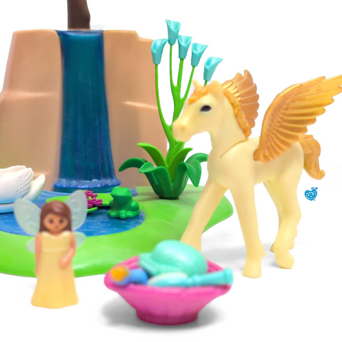 Automatische uitschakeling: na ca. 4 minuten. Aan de zijkant achter de waterval bevindt zich een grot. De feeënbaby kan niet bewegen, het vleugelelement is afneembaar. Incl. 1 Pegasus veulen, zwaan, kolibrie, reuze vlinder en 2 kleine elfjes en 1 Playmobil speelfiguur.