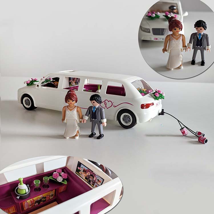 De Playmobil limousine is voorzien van een trekhaak, maar is niet geschikt voor bediening op afstand. Het snoer met de blikjes kan aan de trekhaak worden bevestigd. Voor het plaatsen van de figuren kan het dak worden verwijderd. Het achterdeel is door een wand die omlaag kan van de chauffeurscabine gescheiden. Op deze wand geeft een etiket een monitor aan waarop de nieuwe trouwfoto’s gepresenteerd worden.