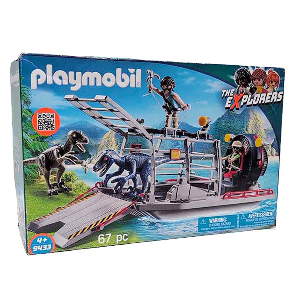 Luchtkussenboot met dinokooi. Niet alleen de Explorers weten van het bestaan van de legendarische dinosaurussen, ook de schurk Quinn is op de hoogte van de wezens uit de oertijd en wil er graag een slaatje uit slaan. Met zijn luchtkussenboot met dinokooi gaat hij op pad om zo veel mogelijk dinosaurussen te vangen. ?Daar zie ik twee Velociraptors, die pakken we!?, roept Quinn opgewonden.