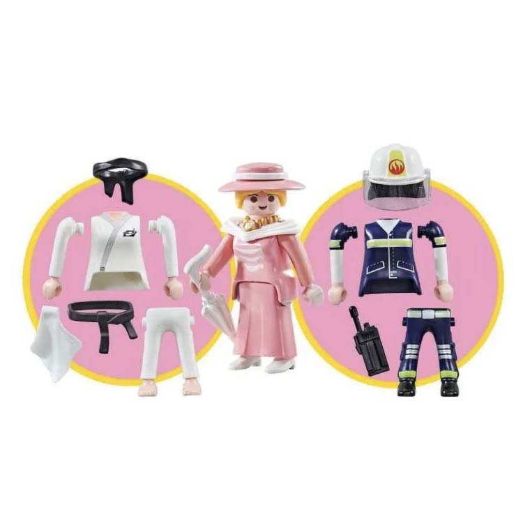 Uniek Playmobil 9855 Multi Play setje. Deze Playmobil speelfiguur kun je veranderen in een Playmobil judoka, Playmobil brandweervrouw en een Playmobil dame. Inclusief zwarte band, paraplu en portofoon.
