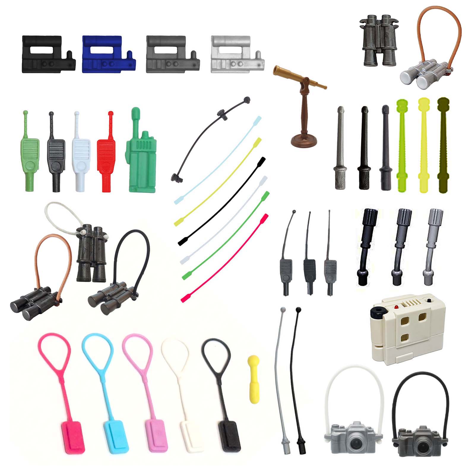 Diverse Playmobil communicatie- en observatie-accessoires zoals walkie-talkies, verrekijkers, camera’s, microfoons en een telescoop.