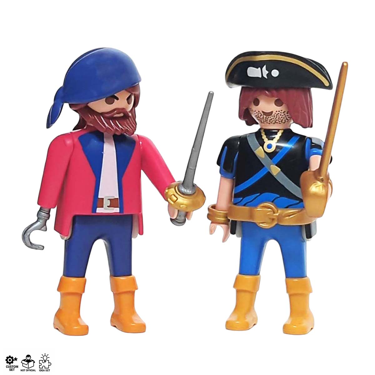 Ahoy, matey! Deze twee stoere Playmobil piraten zijn tot op de tanden gewapend met pistolen en zwaarden, klaar om de zeven zeeën te veroveren en schatten te vinden! Met hun vastberaden blik en hun piratenkledij zetten de piraat en de corsair koers naar avontuur en spanning. Durf jij het aan om samen met hen op zoek te gaan naar verborgen schatten en legendarische piratenschepen te plunderen?