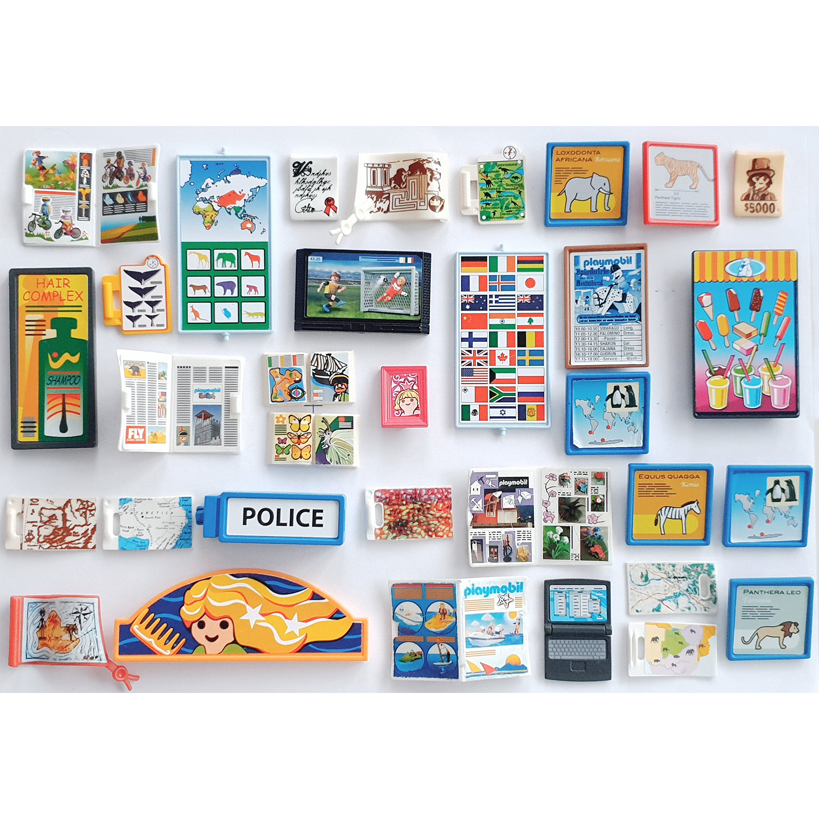 Bevat onder meer stickers met diereninformatie (zoals de leeuw, zebra en olifant), modetijdschriften, reisposters, sportbeelden en ijsreclames – een speels eerbetoon aan de rijke Playmobil-wereld vol details en fantasie.
