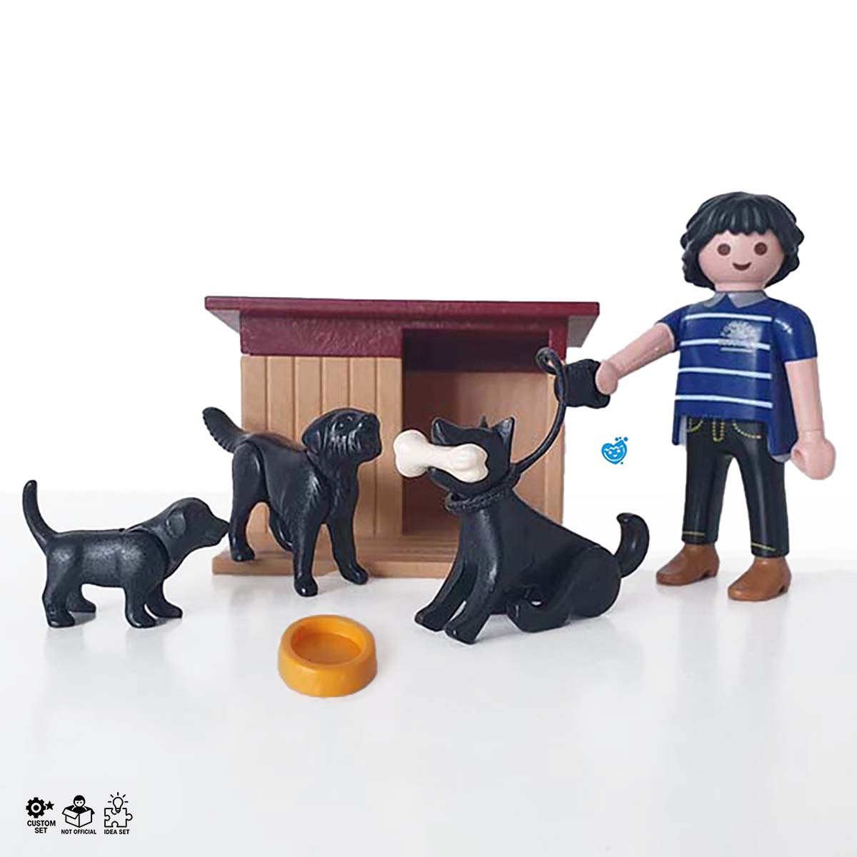 Zorg goed voor je hond en haar 3 puppy’s. Hondenhok met afneembaar dak. Inclusief 1 figuur, voerbakje, hondenriem en kluifbot.