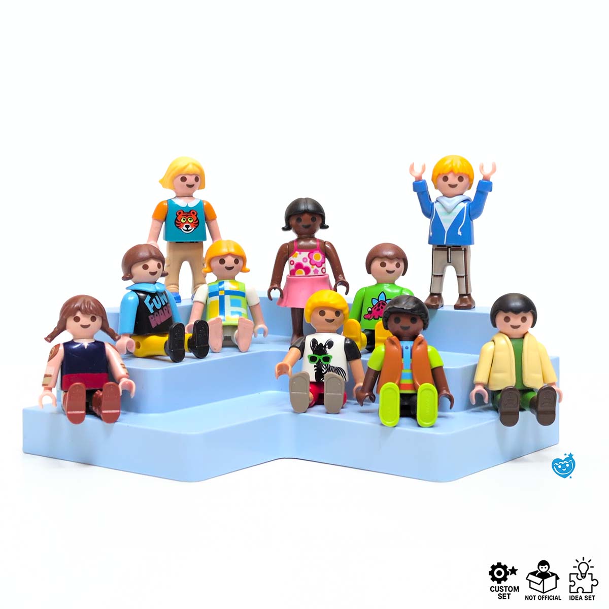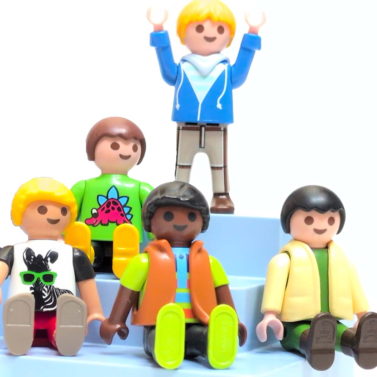 “Recht zitten! Handen op schoot! Niet je tong uitsteken!” — de Playmobil schoolfotograaf heeft z’n handen vol aan dit stel. Gelukkig zitten ze uiteindelijk braaf op de blauwe tribune, al kijkt er altijd eentje net de verkeerde kant op. Wat een leuke schoolkinderen!
