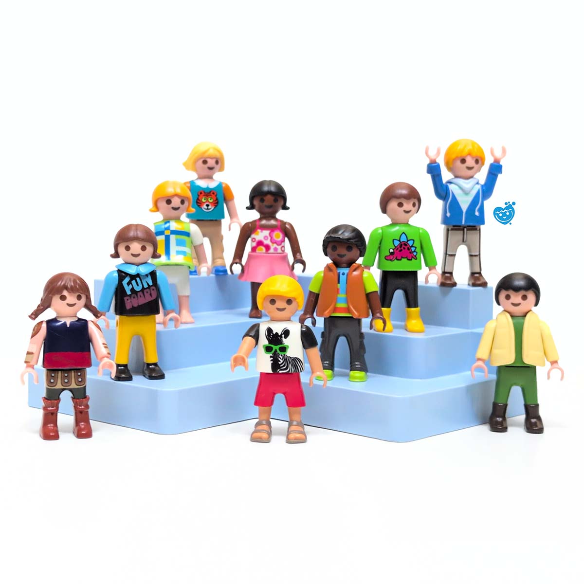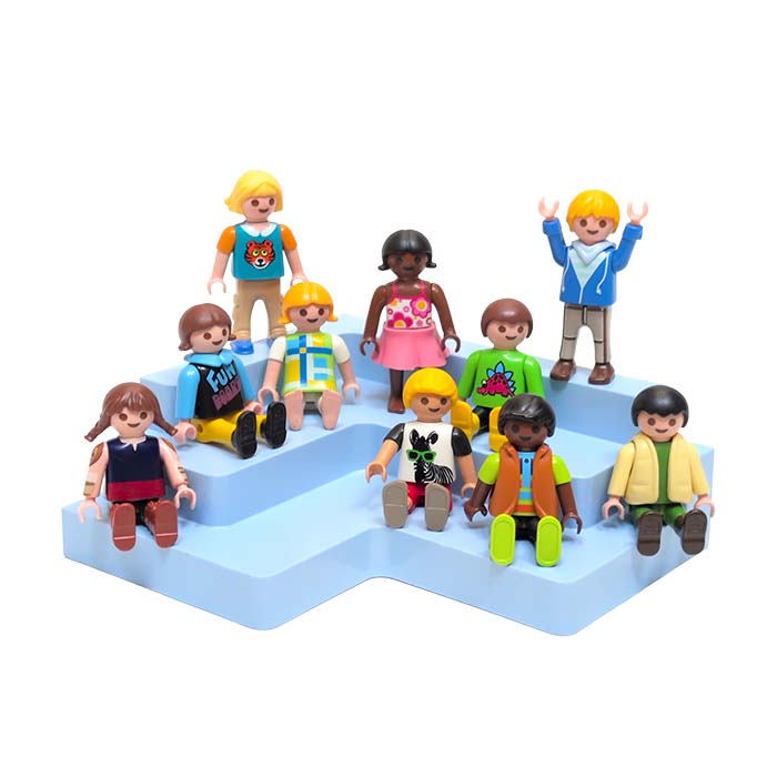 De schoolfotograaf is langs geweest! Deze vrolijke set bestaat uit een groep Playmobil kinderen die samen op de foto gaan. Ze zitten netjes op de blauwe tribune en poseren allemaal in hun mooiste outfit. Een kleurrijk en divers gezelschap dat perfect past in je klaslokaal of stadsthema.