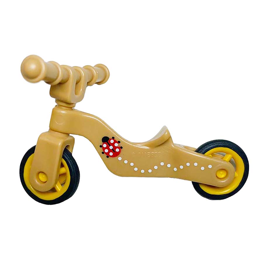 Dit is een Playmobil loopfietsje, waarschijnlijk onderdeel van een Playmobil-set. Het fietsje is beige van kleur en heeft gele wielen. Op de zijkant van het frame is een lieveheersbeestje afgebeeld, omringd door witte stippen.