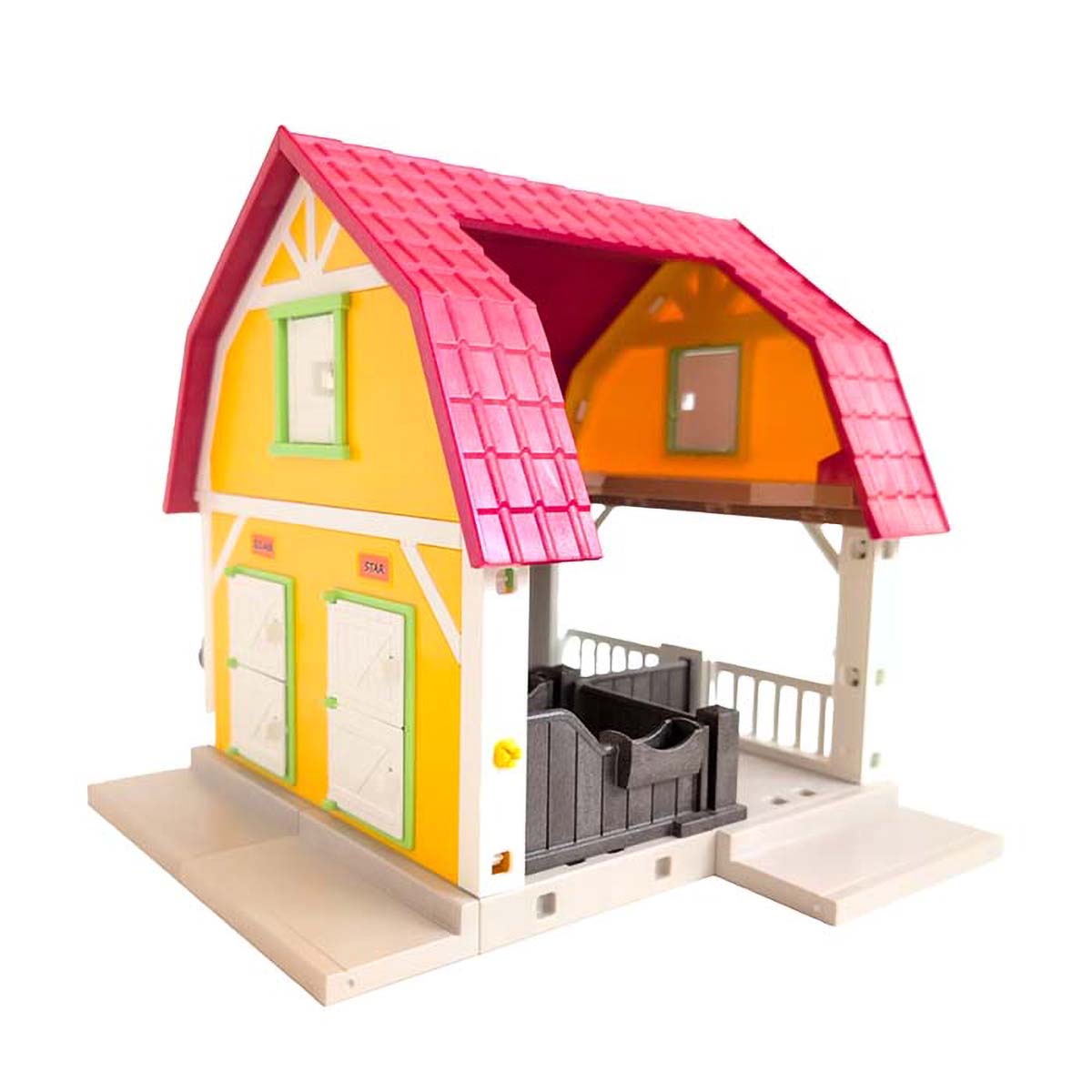Op de ponyranch van Playmobil is het normaal altijd een drukte van jewelste. Er is ruimte voor 3 paarden in de boxen en er is ook nog een hooizolder. Alleen dit gebouw staat in de schoolweken altijd maar leeg. Je kunt natuurlijk de set vullen met jouw mooiste veulens en dierenverzorgers.