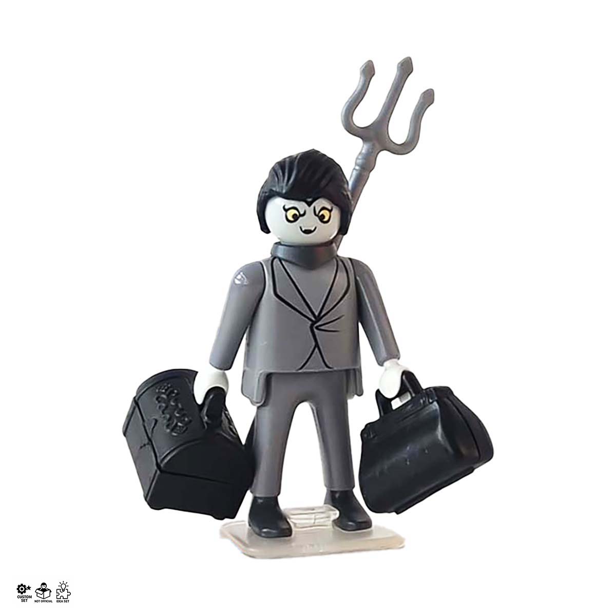 Playmobil uitvaartverzorger in grijs pak. Inclusief zwarte koffer, zwarte tas, grijze drietand (vork) en transparante display-standaard.